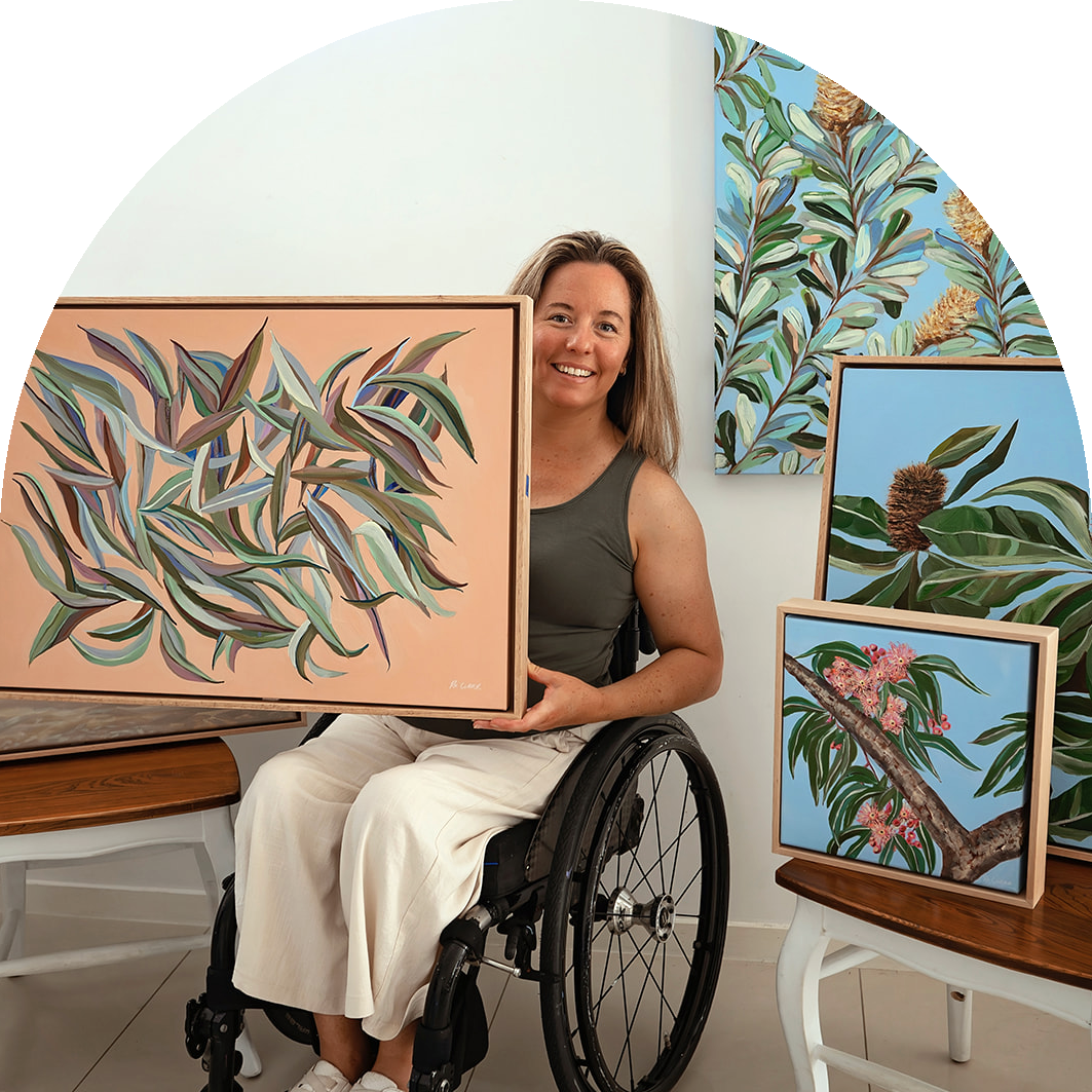 I am a Sunshine Coast based artist and graphic designer with over 14 years' industry experience. After acquiring a spinal cord injury in 2019, I found solace and expression through my painting. Working from my home studio, I create original acrylic artworks, limited-edition prints and seamless repeat pattern designs.